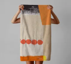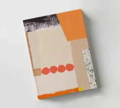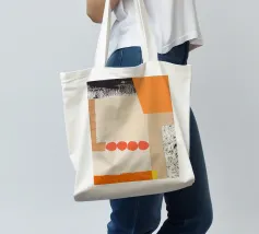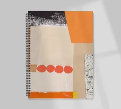 Questa immagine è un collage a tecnica mista con una miscela di pezzi di carta testurizzata nei toni dell'arancione, del crema, del beige e del nero. Il collage è composto da diversi strati, tra cui carta con motivi a griglia, bordi strappati e una sezione con una stampa nera strutturata che ricorda le pennellate o le macchie d'inchiostro. Una serie di quattro forme circolari rosso-arancio disposte in fila aggiunge un accento audace e giocoso alla composizione. Nell'angolo in alto a destra si trova una forma di colore arancione brillante.