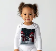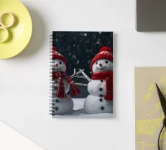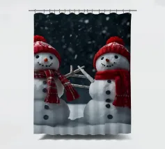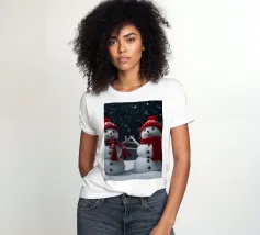 Due adorabili pupazzi di neve, vestiti con sciarpe rosse e cappelli lavorati a maglia, sorridono tra i fiocchi di neve che cadono dolcemente in un paese invernale di notte.