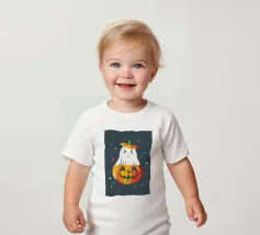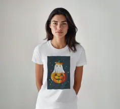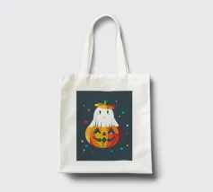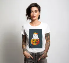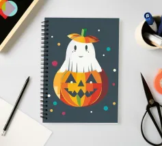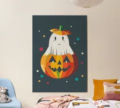 Un piccolo fantasma è felicemente infilato in una zucca luminosa e indossa un cappello a forma di zucca: un allegro motivo di Halloween pieno di colore e buonumore.