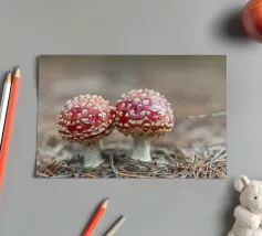 Due piccole agariche volanti stanno insieme, una coppia affascinante nel cuore della foresta.