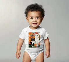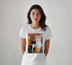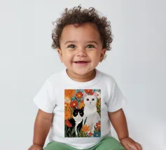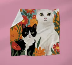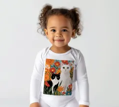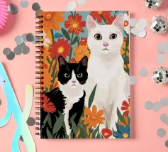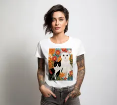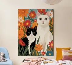 Un bellissimo ritratto di due gatti, uno bianco e nero e l'altro bianco, seduti insieme in mezzo a un campo vibrante e denso di fiori colorati, che catturano un momento di amicizia.