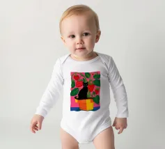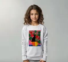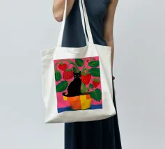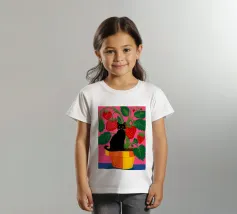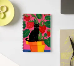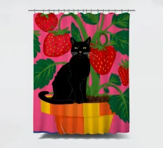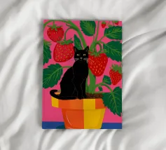 Un gatto nero siede regalmente in un vaso giallo circondato da fragole rosse e foglie verdi su uno sfondo rosa, creando una composizione a tema animale giocosa, colorata e affascinante.