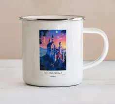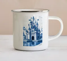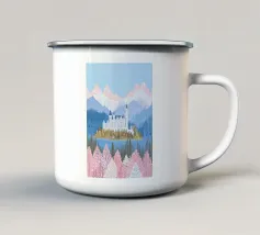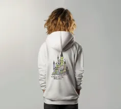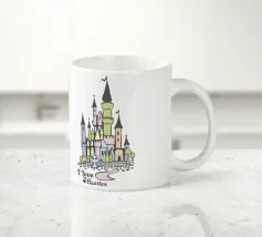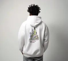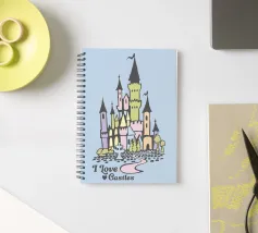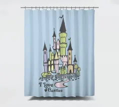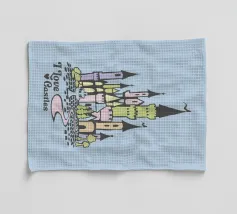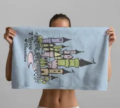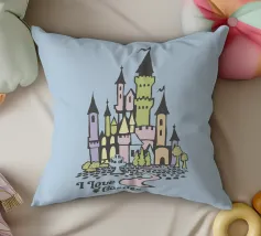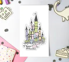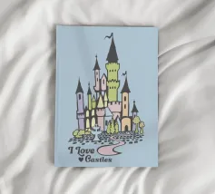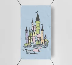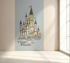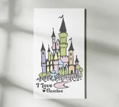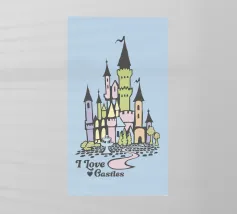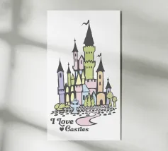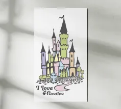 Il design mostra un castello da favola con molte torri e campate in colori pastello tenui come il rosa, il giallo, il blu e il verde. I tetti e le torri sono di colore grigio scuro, per creare contrasti. Un sentiero curvo conduce al cancello del castello, fiancheggiato da fiori, alberi e una fontana. Lo sfondo è trasparente, per rendere il motivo universalmente applicabile. La scritta "I Love ♥ Castles" è riportata in basso in modo giocoso. Il disegno ha un aspetto sognante e romantico, ideale per gli amanti delle fiabe o per applicazioni decorative.
