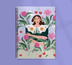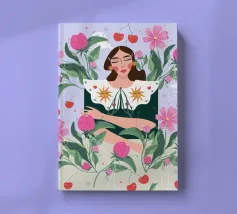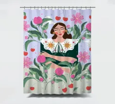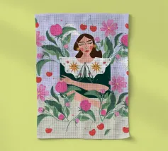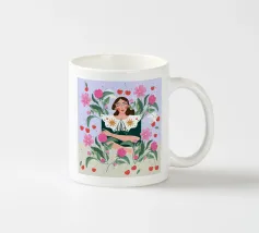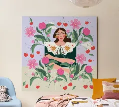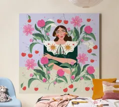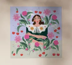 Un'illustrazione serena e poetica che raffigura una donna pacifica con gli occhi chiusi, avvolta da fiori rosa in fiore, motivi di ciliegie e leggiadre colombe. Con i simboli del sole sul colletto oversize e i toni caldi e terrosi, quest'opera d'arte evoca un'energia femminile e sognante e lo spirito della primavera e del rinnovamento. Perfetto per gli amanti dell'arte che apprezzano i disegni stravaganti ispirati alla natura con un tocco moderno. Ideale per l'arredamento della casa, per l'arte da parete o come regalo di cuore.