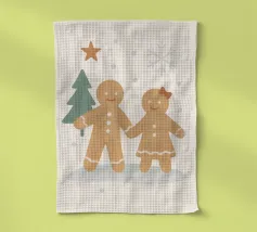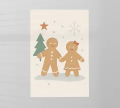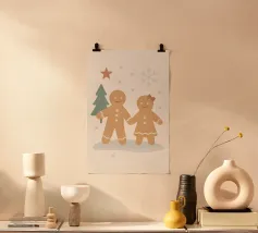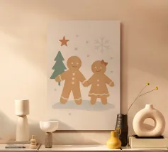 Due adorabili personaggi di pan di zenzero si tengono per mano in un morbido scenario innevato, irradiando calore e allegria natalizia. Le forme semplici e i colori scandinavi rendono questa stampa un'aggiunta affascinante alle cucine, alle camere dei bambini o come dolce regalo di Natale.