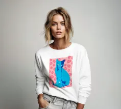 Una vivace illustrazione di gatti ispirata alla pop-art, con un sorprendente felino blu dalla finitura astratta e strutturata. Su uno sfondo rosa, con una vivace stampa di labbra, questo disegno emana fascino e un'estetica moderna. Perfetto per gli amanti dei gatti e per chi apprezza l'arte colorata e accattivante!