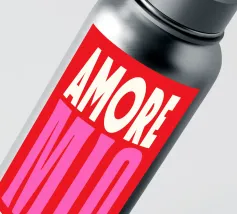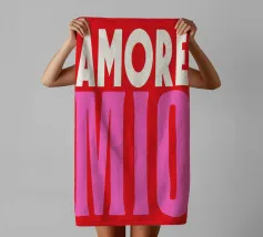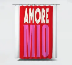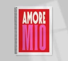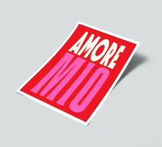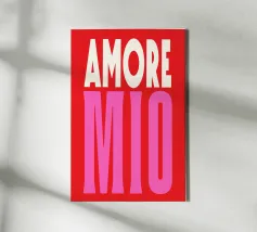 La scritta "Amore Mio" risplende in un vibrante rosa e bianco su un audace sfondo rosso. La moderna tipografia incarna la tendenza italiana e irradia un appassionato messaggio d'amore.