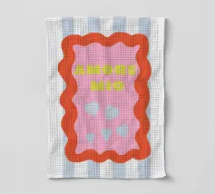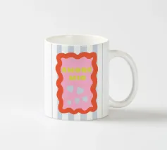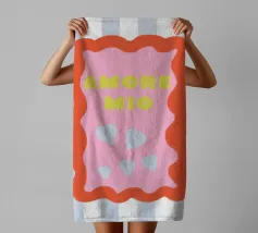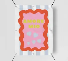 Questo motivo presenta un'allegra composizione tipografica con la scritta "amore mio" in giallo brillante, incorniciata da strisce azzurre e cuori giocosi. Il design colorato e l'illustrazione chiara creano una vera e propria atmosfera di benessere. Lo stile decorativo moderno e giocoso rende il poster un vivace e moderno richiamo visivo.