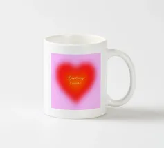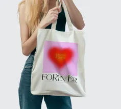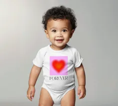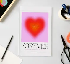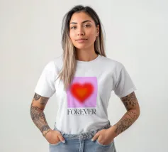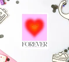 Grafica minimal astratta personalizzabile con cuore sfumato in rosso vibrante, arancione e rosa, con grande scritta 'FOREVER' in un carattere decorativo serif. Un'opera d'arte perfetta per celebrare l'amore, il giorno dell'amore, San Valentino e l'amore per i bambini. Per una coppia o una persona sola