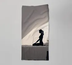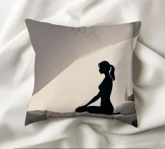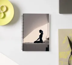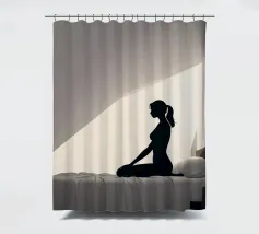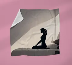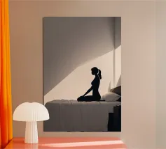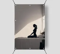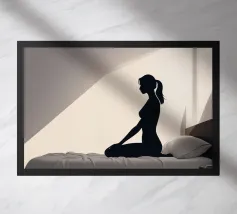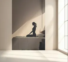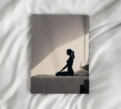 La silhouette calma di una donna seduta tranquillamente sul suo letto mentre la luce del sole filtra dalla finestra. Una riflessione sulle mattine lente, sulla serenità e sull'equilibrio tra luce e riposo.