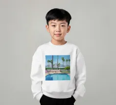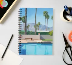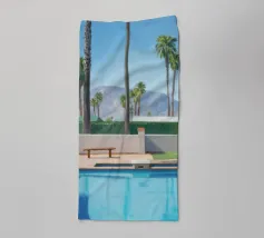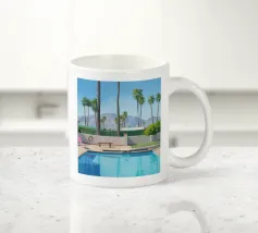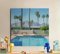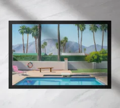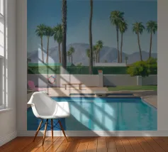 Una piscina con acqua cristallina, un salvagente rosa e palme sullo sfondo, tipica di un resort nel deserto.