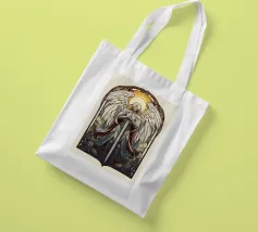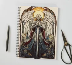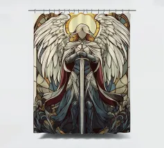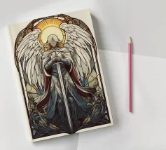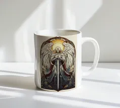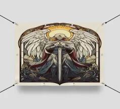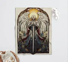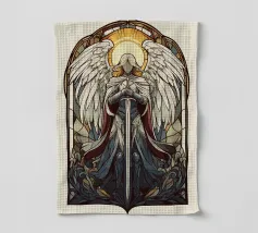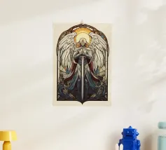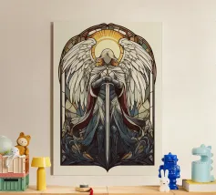 Un maestoso angelo con le ali spiegate e un'aureola luminosa si trova al centro di una finestra stilizzata di una chiesa in questa dettagliata raffigurazione. La figura alata tiene una spada in entrambe le mani, simbolo di protezione, giustizia e forza. La realizzazione artistica ricorda l'arte sacra del vetro e combina il simbolismo spirituale con il design epico dei personaggi. Perfetto per gli appassionati di fantasy, per le stanze a tema spirituale o come elemento potente e ispiratore nelle aree meditative.