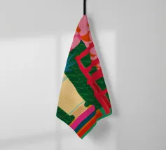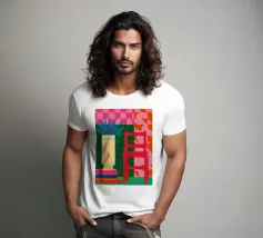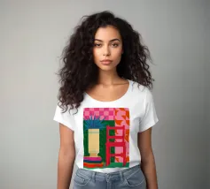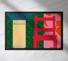 Rappresentazione astratta dell'interno di una stanza con una sedia rossa, una pianta verde e forme geometriche. L'uso audace dei colori, tra cui il rosa, il verde e il giallo, e la prospettiva frammentata creano una visione artistica dinamica e moderna.