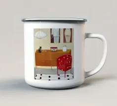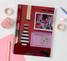 Un dettaglio dell'interno mostra una parete rossa che fa da sfondo a un vaso di fiori a righe bianche e nere, vicino a una mensola con libri, oggetti e una piccola pianta in vaso.