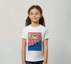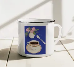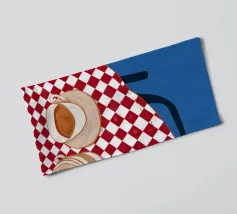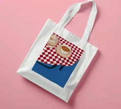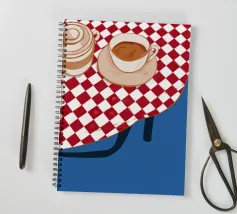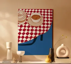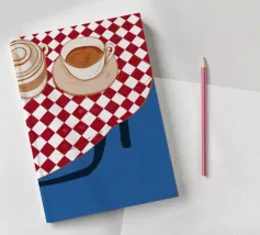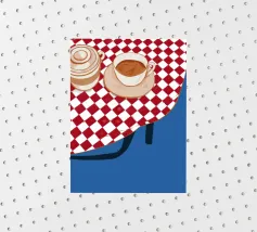 Illustrazione grafica e minimalista di una tazza di caffè su un piattino, appoggiata sul bordo di un tavolo con una tovaglia a scacchi rossi e bianchi.