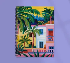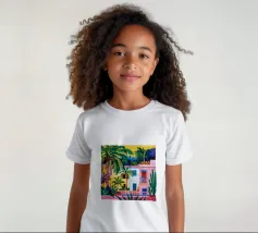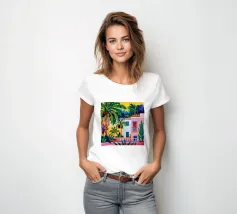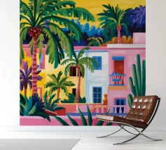 Un angolo di strada illuminato dal sole in un ambiente tropicale, con un edificio bianco e pulito con un balcone blu, circondato da palme lussureggianti e fiori rosa vivaci.