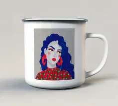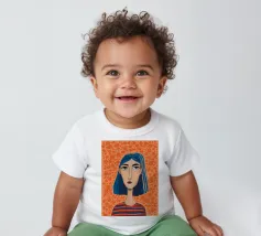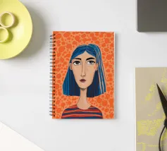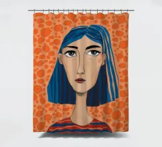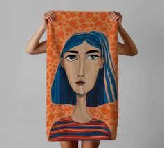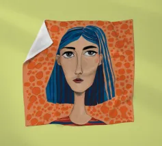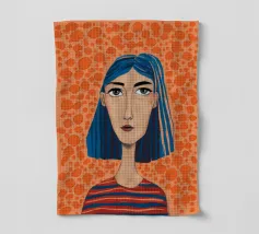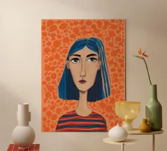Ritratto moderno e artistico di una donna con capelli corti blu e camicia a righe arancioni e bianche. Il suo sguardo diretto e riflessivo e i colori decisi creano un'immagine suggestiva e memorabile.