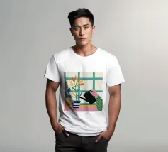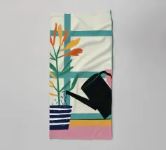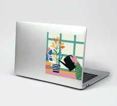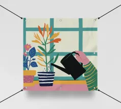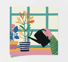 Illustrazione di una persona che innaffia una pianta in vaso con un fiore di uccello del paradiso. Questa scena semplice e domestica è una rappresentazione bella, serena e delicata del nutrimento e della cura.