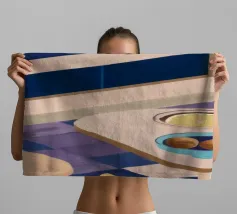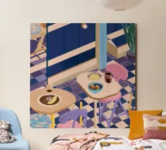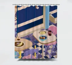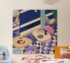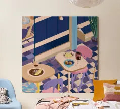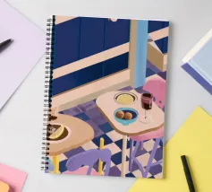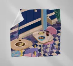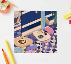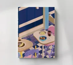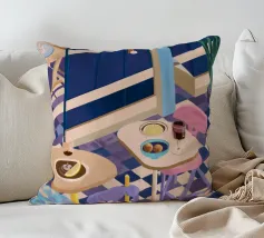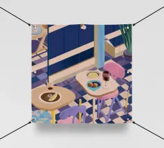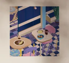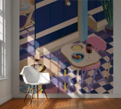 Una scena serena di un appuntamento per un caffè su un balcone illuminato dal sole, con un pavimento a scacchi viola e una vista sul mare. L'illustrazione cattura un momento di connessione pacifica e di svago elegante.