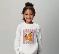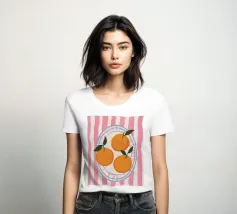Illustrazione semplice e pulita di tre arance su un piatto, su uno sfondo a strisce verticali bianche e rosa. Lo stile è grafico e moderno.