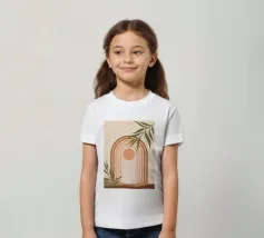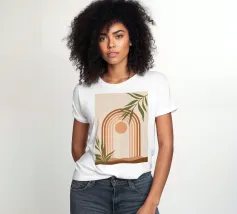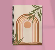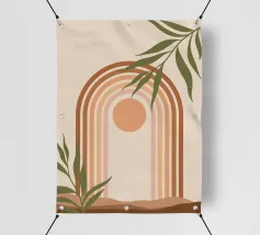 Un design minimalista mostra un arco dai toni caldi con un sole al centro, incorniciato da motivi astratti di foglie. I colori della terra e le forme geometriche evocano un'atmosfera serena e naturale.