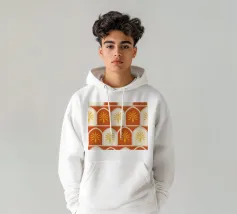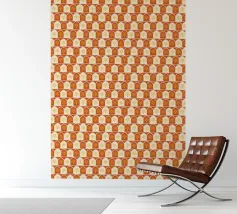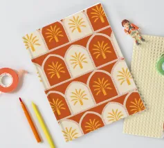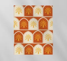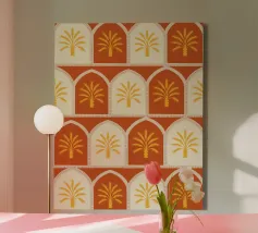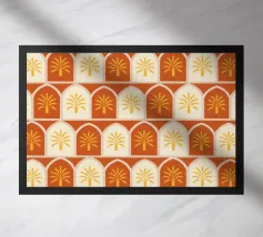 Questa stampa d'arte presenta file di palme dorate incorniciate in caldi archi color terracotta e crema. Il motivo ripetuto conferisce un'atmosfera accogliente e rustica al deserto. Perfetto per aggiungere un tocco di fascino solare e di eleganza terrena alle vostre pareti.