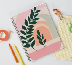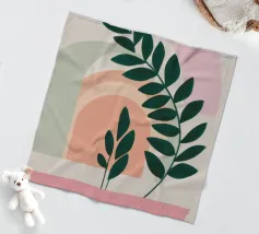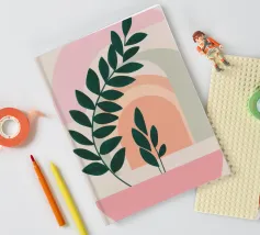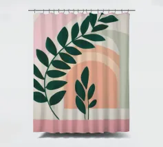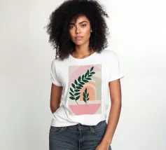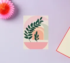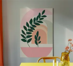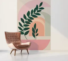 Una natura morta minimalista e moderna con un ramo verde in un vaso, incorniciato da un arco color terracotta su uno sfondo rosa tenue.