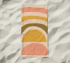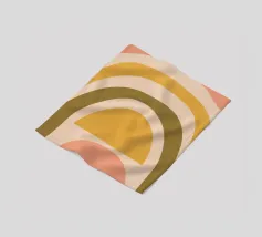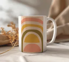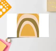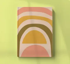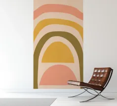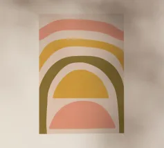 Questa immagine mostra un'illustrazione astratta di un arcobaleno con colori tenui. L'arcobaleno è composto da bande curve nei toni del rosa, del giallo e del verde, creando un design minimalista e moderno.