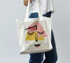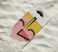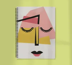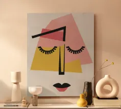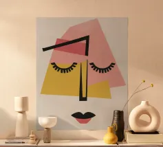 Un volto astratto minimalista con occhi chiusi, composto da semplici forme geometriche. La tavolozza di colori rosa, giallo, nero e beige crea un'espressione serena e assonnata, che incarna la tranquillità.
