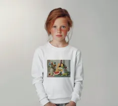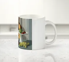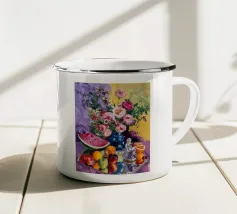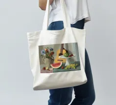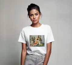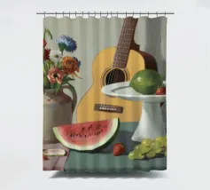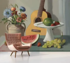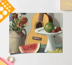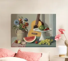 Una natura morta rustica e calda con una chitarra, una brocca, un'anguria e dell'uva. La composizione evoca un senso di vita di campagna piacevole e creativa, con toni caldi e terrosi e una disposizione rilassata e armoniosa.