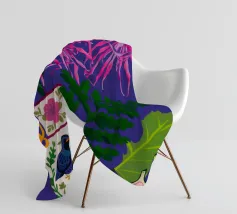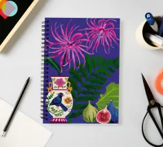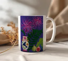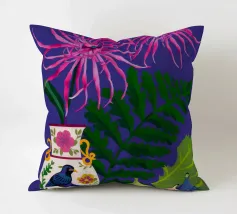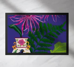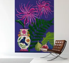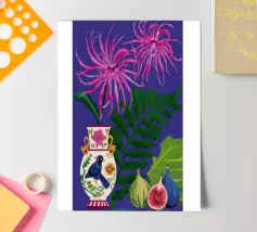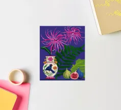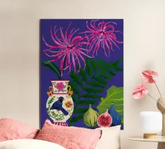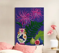 Una natura morta bella e lunatica con fiori rosa magenta e una felce delicata in un vaso a fantasia, con un singolo fico sul tavolo.