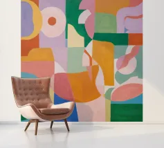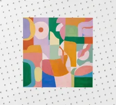 Quest'opera d'arte presenta una composizione astratta con forme geometriche e colori vivaci. I colori dominanti sono il verde, il rosa e il giallo, che creano un'esperienza visiva armoniosa e vivace.