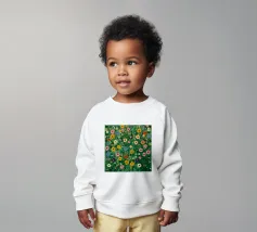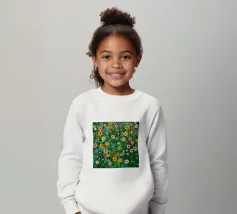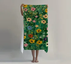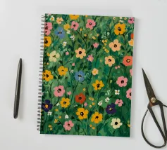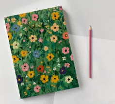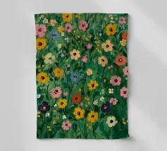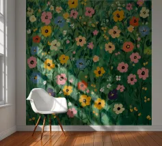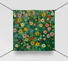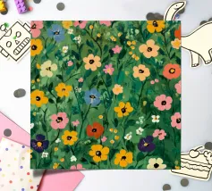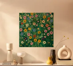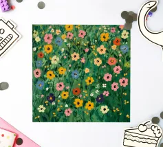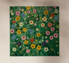 Questa allegra opera d'arte floreale presenta un vibrante sfondo verde pieno di fiori naif disegnati a mano in un'esplosione di colori. I fiori giocosi spaziano dai rossi, gialli e blu vivaci ai rosa tenui e ai viola, creando un'atmosfera gioiosa e stravagante. Il design abbraccia la semplicità, con forme imperfette e organiche e contorni decisi che emanano fascino e carattere. La vivace composizione è spensierata e piena di energia, e rappresenta una celebrazione della diversità della natura e una perfetta rappresentazione della felicità e della creatività.