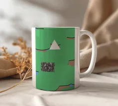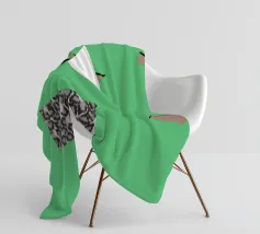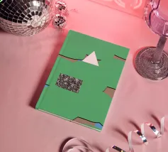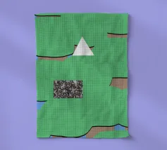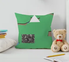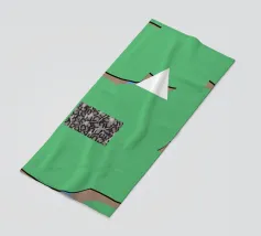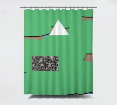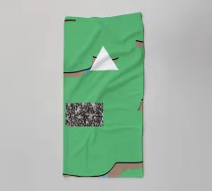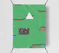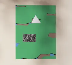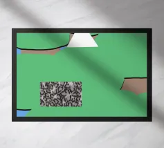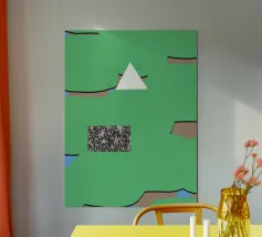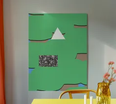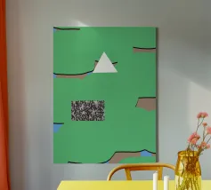 Una serie di forme astratte riempie lo spazio con segmenti verdi delimitati da linee nere, intersecati da un triangolo bianco. Un rettangolo monocromatico a motivi contrasta con lo sfondo colorato.