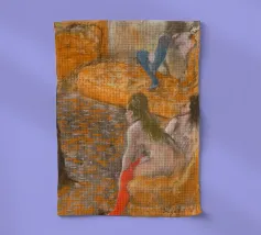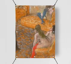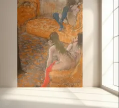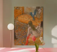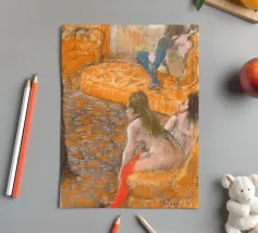 Immergetevi nel mondo intimo di Edgar Degas con questo splendido poster di "Aspettando un cliente" (1879). Questa accattivante opera impressionista raffigura tre donne in un momento di tranquilla introspezione, resa con il caratteristico uso magistrale di Degas di pastelli e linee morbide e suggestive. L'arancione vibrante e i toni tenui creano un'atmosfera calda ed evocativa, invitando gli spettatori a riflettere sul racconto che vi è contenuto. Questa riproduzione d'arte digitale di alta qualità, con una risoluzione di 7000x5000 pixel e 300 dpi, assicura che ogni delicato tratto e sfumatura del genio di Degas sia magnificamente conservato, offrendo un'aggiunta squisita al quadro.
