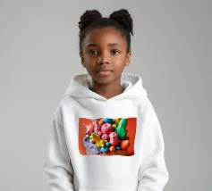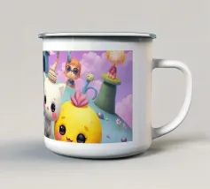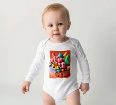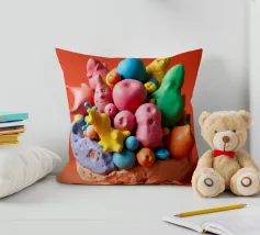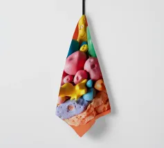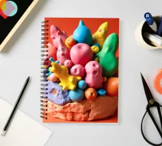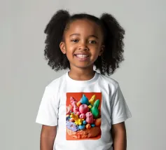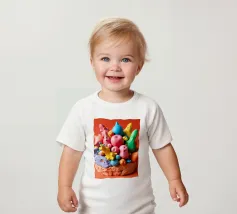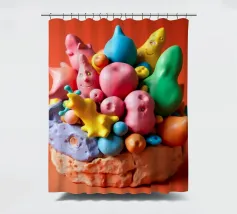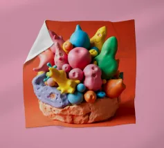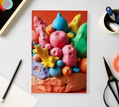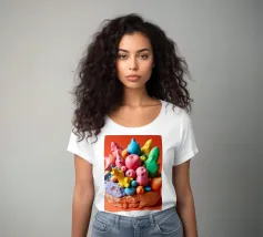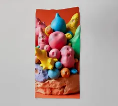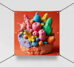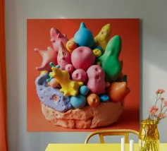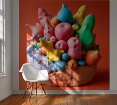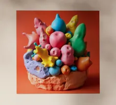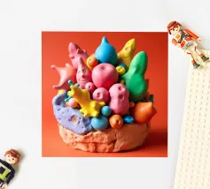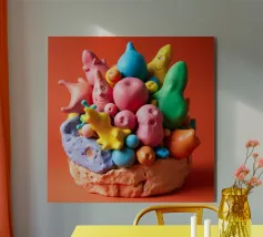 Forme e personaggi dai colori vivaci e giocosi sono disposti artisticamente su una superficie strutturata, mostrando una creatività vibrante ed elementi di design stravaganti.