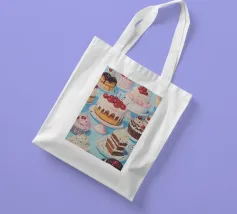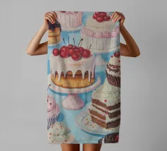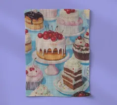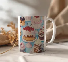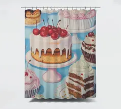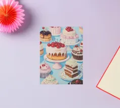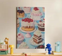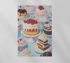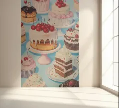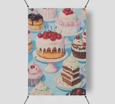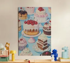 Una vivace opera d'arte che presenta una varietà di torte e cupcake splendidamente decorati, con ciliegie, glassa e zuccherini su uno sfondo blu pastello.