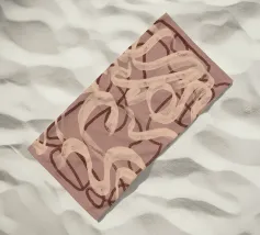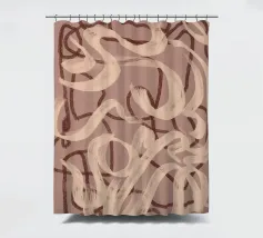 Forme e linee astratte nei toni del marrone e del beige si intrecciano su uno sfondo rosa tenue. La composizione crea un senso di movimento e fluidità, con pennellate ampie e forme sovrapposte.
