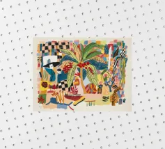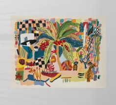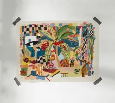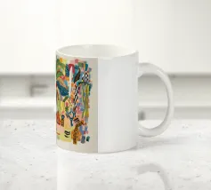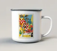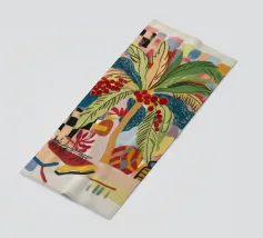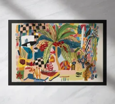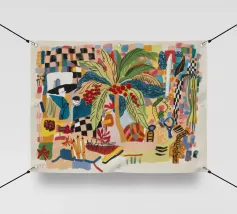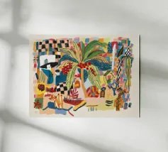 Il dipinto presenta una composizione astratta di fiori e piante. La tavolozza dei colori comprende tonalità di blu, giallo e bianco, creando una composizione armoniosa ed equilibrata.