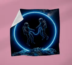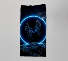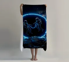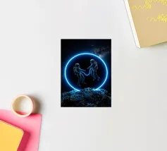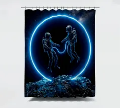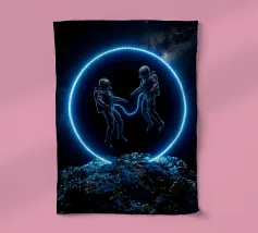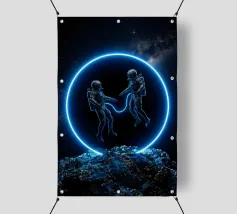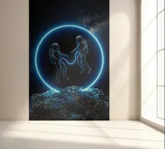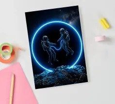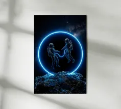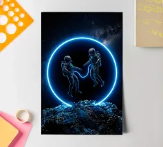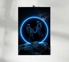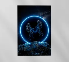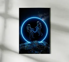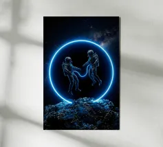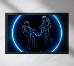 Due astronauti alla deriva senza peso nello spazio profondo, collegati da una linea di energia incandescente all'interno di un radioso portale cosmico. Questa futuristica opera d'arte spaziale simboleggia la connessione umana, l'unità e l'esplorazione oltre i confini. Il sorprendente anello blu neon contrasta magnificamente con lo sfondo scuro della galassia, creando una potente estetica fantascientifica. Perfetto per gli interni moderni, le sale giochi e gli amanti della fantascienza, questo disegno conferisce un senso di meraviglia, tecnologia e armonia cosmica a qualsiasi decorazione murale.