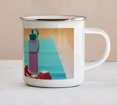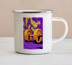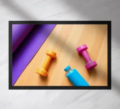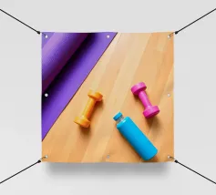 Un tappetino da yoga di colore viola è appoggiato su un pavimento di legno, mentre manubri arancioni e rosa e una bottiglia d'acqua blu sono posizionati nelle vicinanze, pronti per una sessione di allenamento.