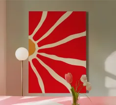 stampa floreale moderna, fioritura astratta rossa, design audace dei petali, arte ispirata alla natura, illustrazione di forme organiche, grafica floreale minimalista