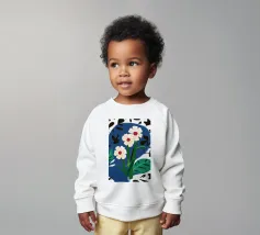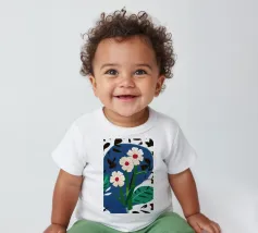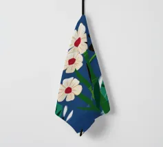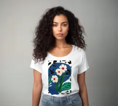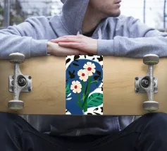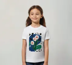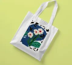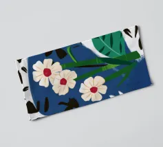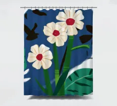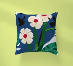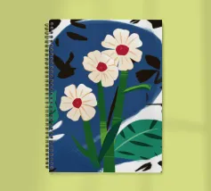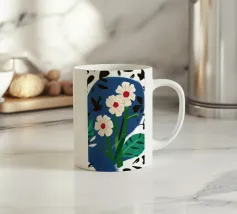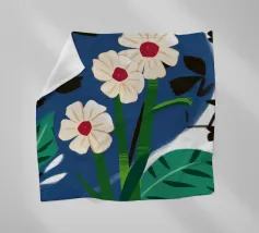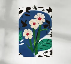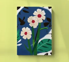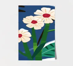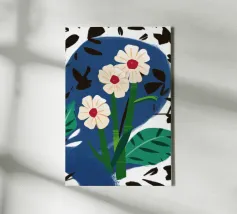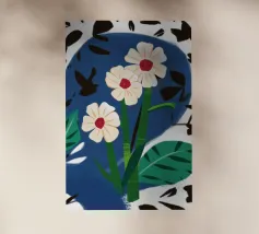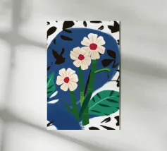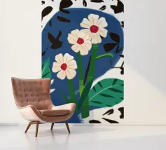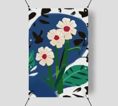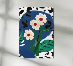 Le margherite bianche con i centri gialli brillanti spiccano su uno sfondo blu scuro con un motivo audace, simile a una stampa di mucca. Il contrasto e le forme semplificate creano una dichiarazione floreale potente ed elegante.