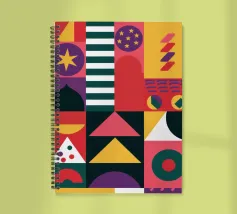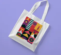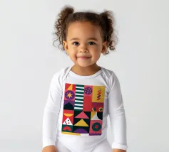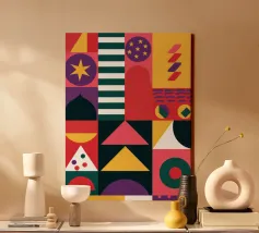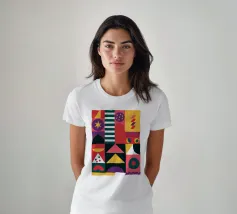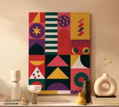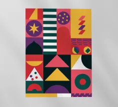 Un mosaico audace e colorato di forme geometriche, triangoli, cerchi e zigzag, si combina in un disegno perfettamente equilibrato e di grande impatto visivo, con un forte appeal grafico.