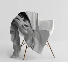 Ritratto di Audrey che soffia gomme da masticare con accappatoio e asciugamano sulla testa, in bianco e nero.