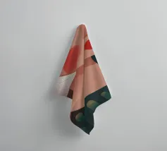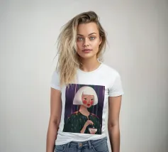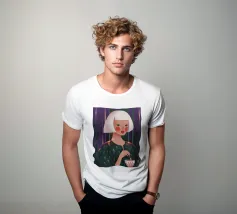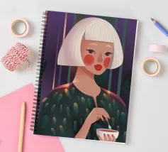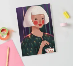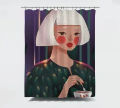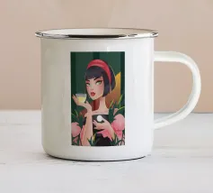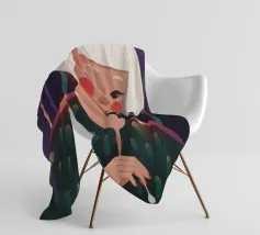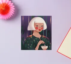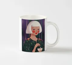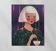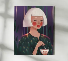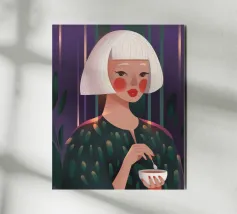 Il dipinto raffigura una persona con i capelli corti e bianchi, che tiene in mano una tazza, su uno sfondo viola intenso con foglie verdi. I toni rilassanti evocano un'atmosfera contemplativa e pacifica.