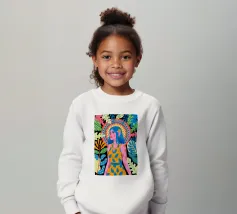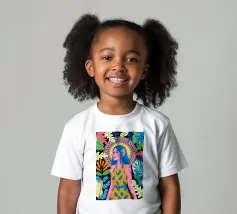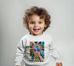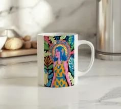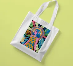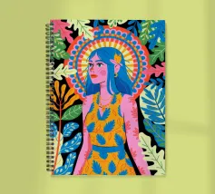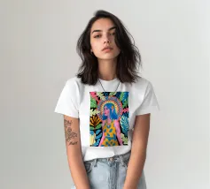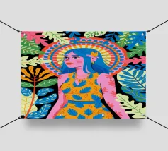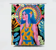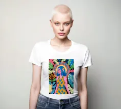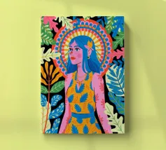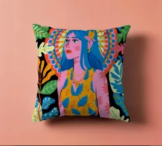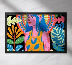 Una donna con sorprendenti capelli blu è circondata da vivaci motivi floreali e di foglie su uno sfondo astratto. Le scelte cromatiche audaci e i dettagli intricati creano una presenza energica e radiosa.