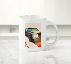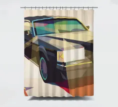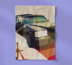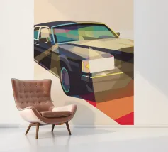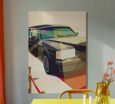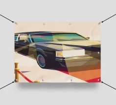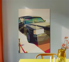 Illustrazione di un'auto d'epoca sul tappeto rosso con uno stile moderno e vintage.