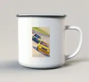 Illustrazione di due auto da corsa che si sfidano in pista con uno stile geometrico dinamico.