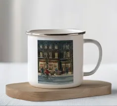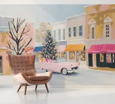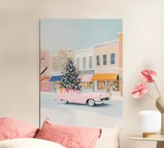 Una sognante scena invernale di una piccola città: vetrine pastello, un albero di Natale scintillante e un'auto rosa retrò carica di regali scivolano lungo una Main Street innevata. Le morbide pennellate in stile gouache e la tavolozza color blush-senape conferiscono un'accogliente nostalgia di metà secolo.